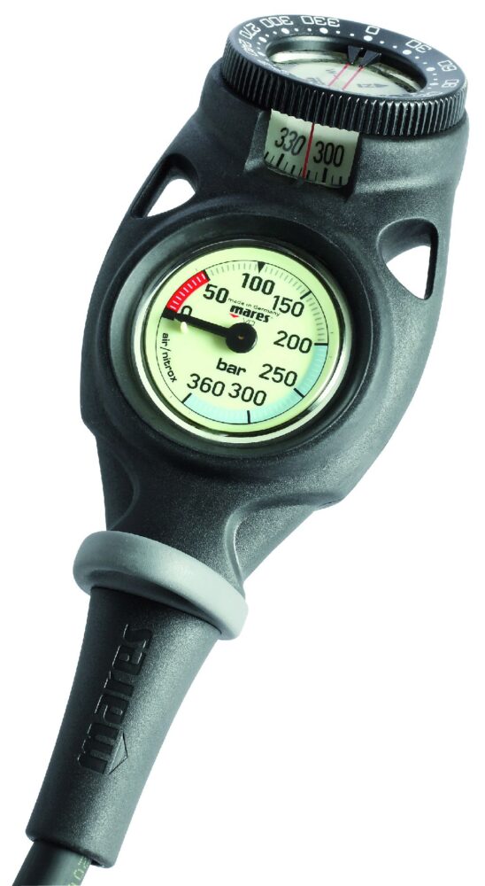 In the Mission 2C, the pressure gauge and compass are combined in a single console. The most interesting aspect of this layout is the inclined position of the compass, which allows the two instruments (compass direction and air supply) to be displayed simultaneously.